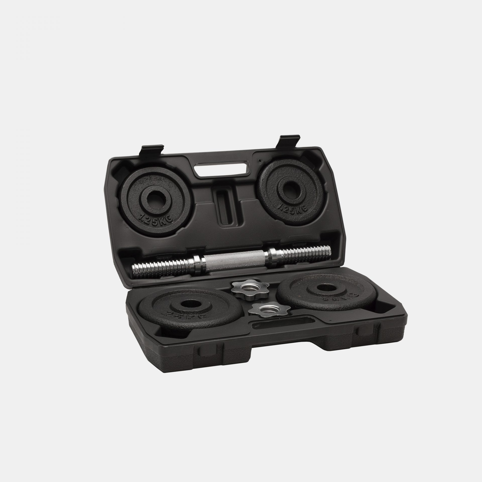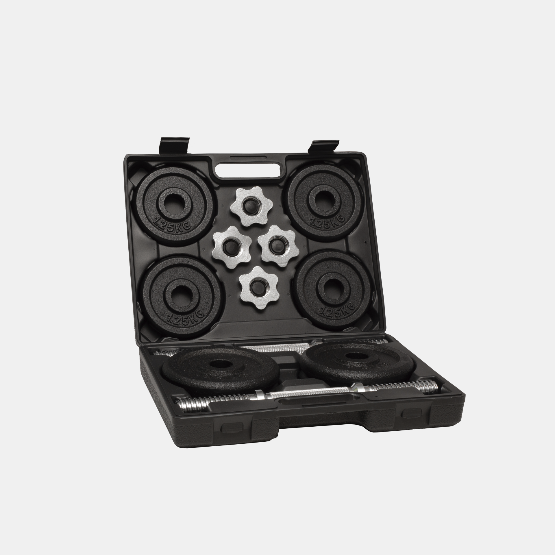 Levyt 2,5kg, 1,25kg + tanko ja lukot. Käsipainot 15,0 kg kpl ja 20kg, joka sisältää 2 tankoa eli 2 x 10kg käsipainot.
